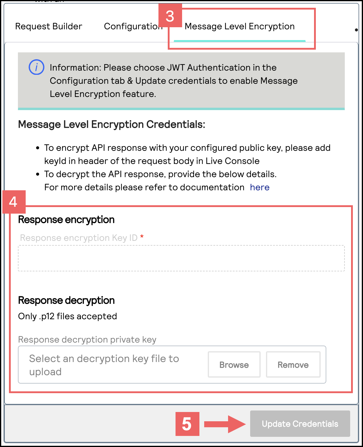 - In the Message Level Encryption Credentials section, enter your API response MLE key credentials:
